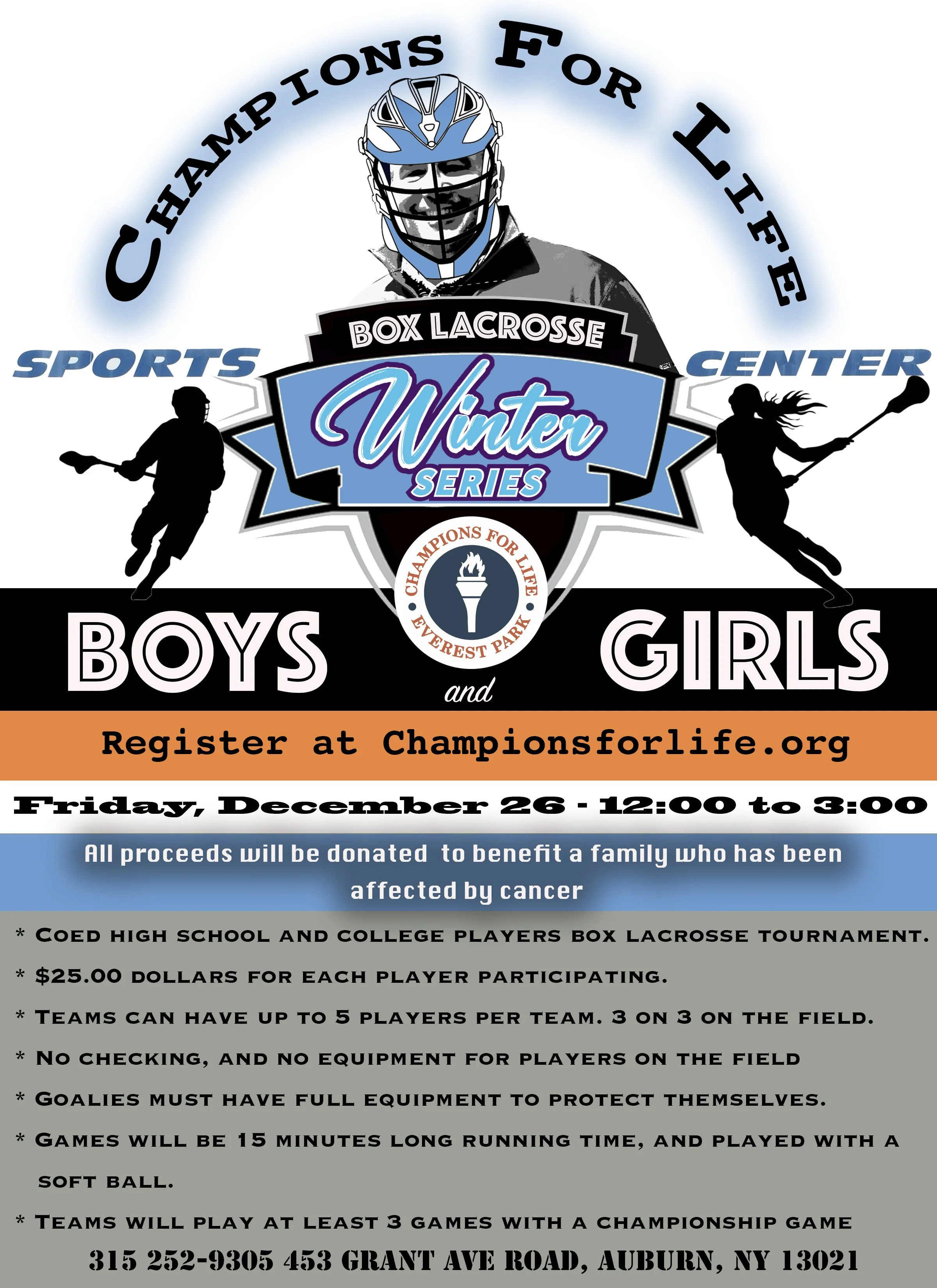 CFL is hosting a Box Lacrosse Tournament for high school and college age players on December 26, 2025, with all tournament proceeds benefitting a local family affected by a recent cancer diagnosis.